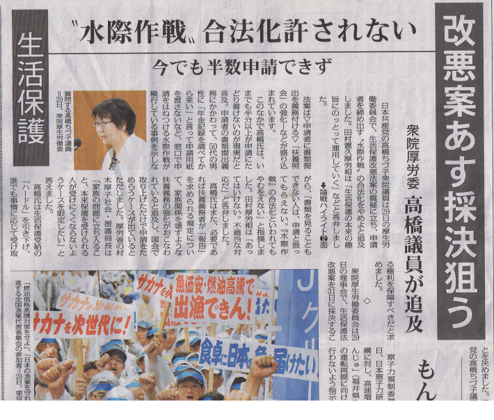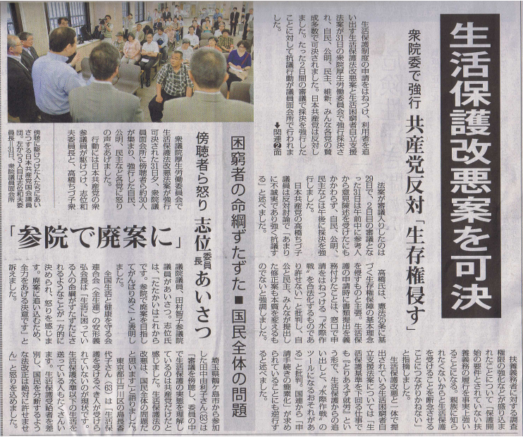 生活保護改悪案を可決「しんぶん赤旗」